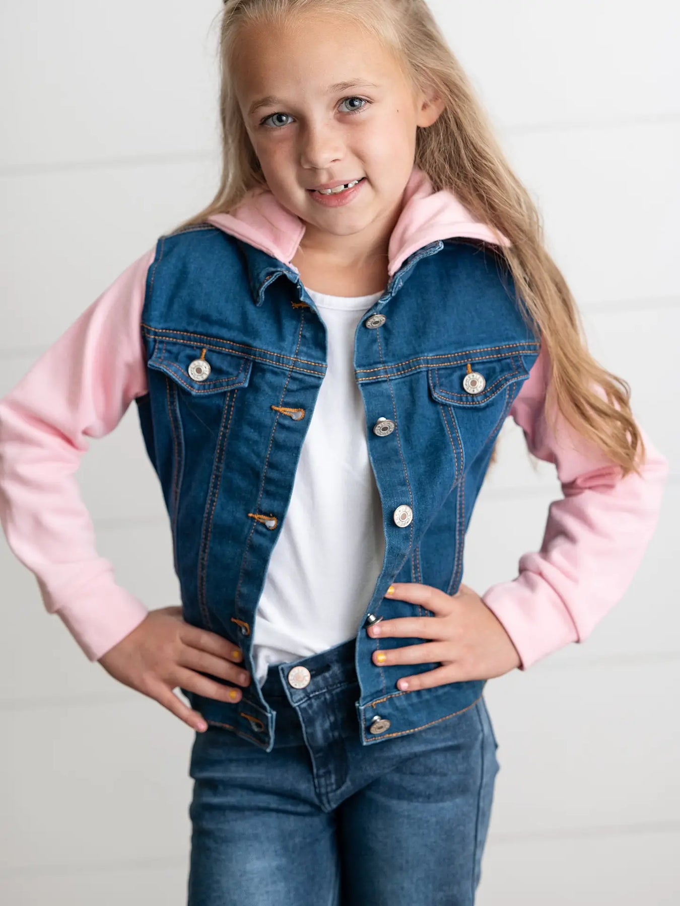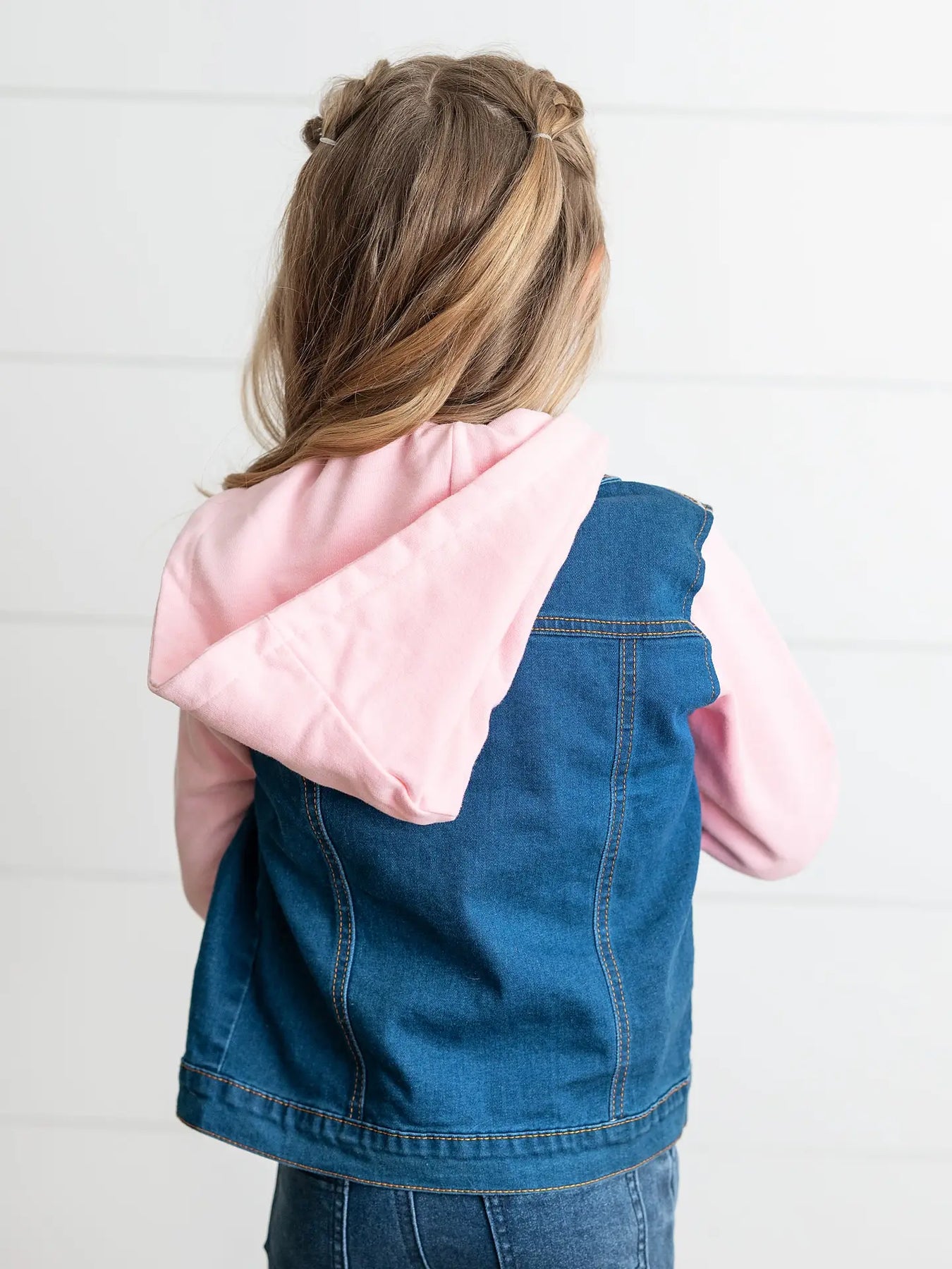 Add a pop of color to your wardrobe with our Pink Hooded Denim Jacket!  Designed with girls in mind, this jacket is both stylish and practical.  With a cozy hood and durable denim fabric, it's perfect for any weather. Stay warm, look cool, and stand out from the crowd with this playful and quirky jacket.
