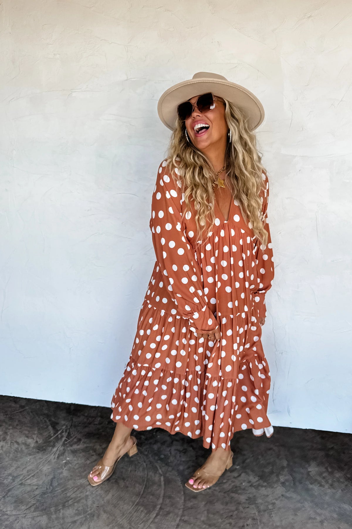 This charming midi dress boasts a playful rust hue perfect for summer and fall.  Its v-neckline and billowy long balloon sleeves with cuffs add flirtatious flair, while the flowy tiered skirt dances with every step.  Embrace effortless style and comfort with a dress designed to move with you from sunny afternoons to crisp evenings.