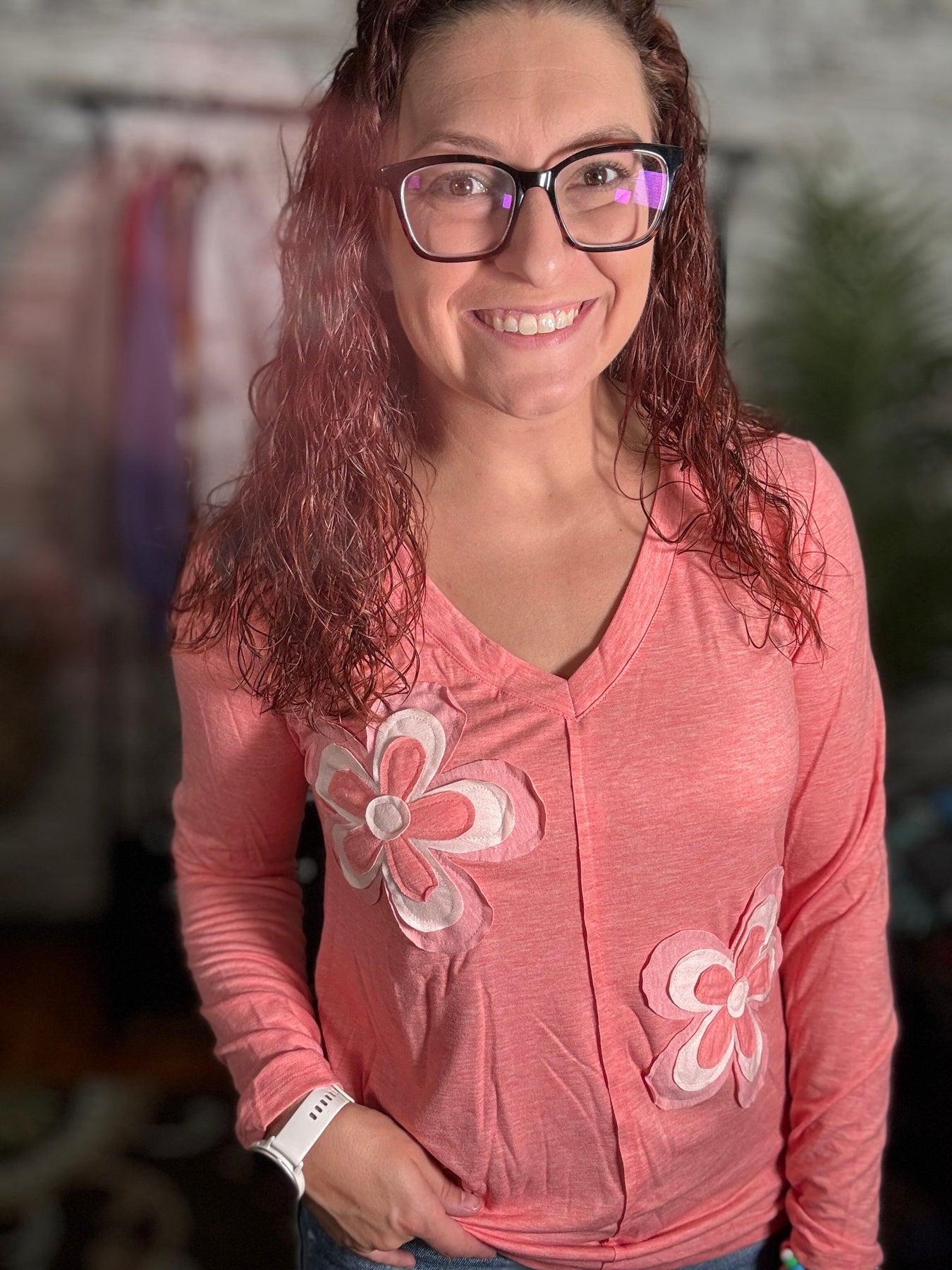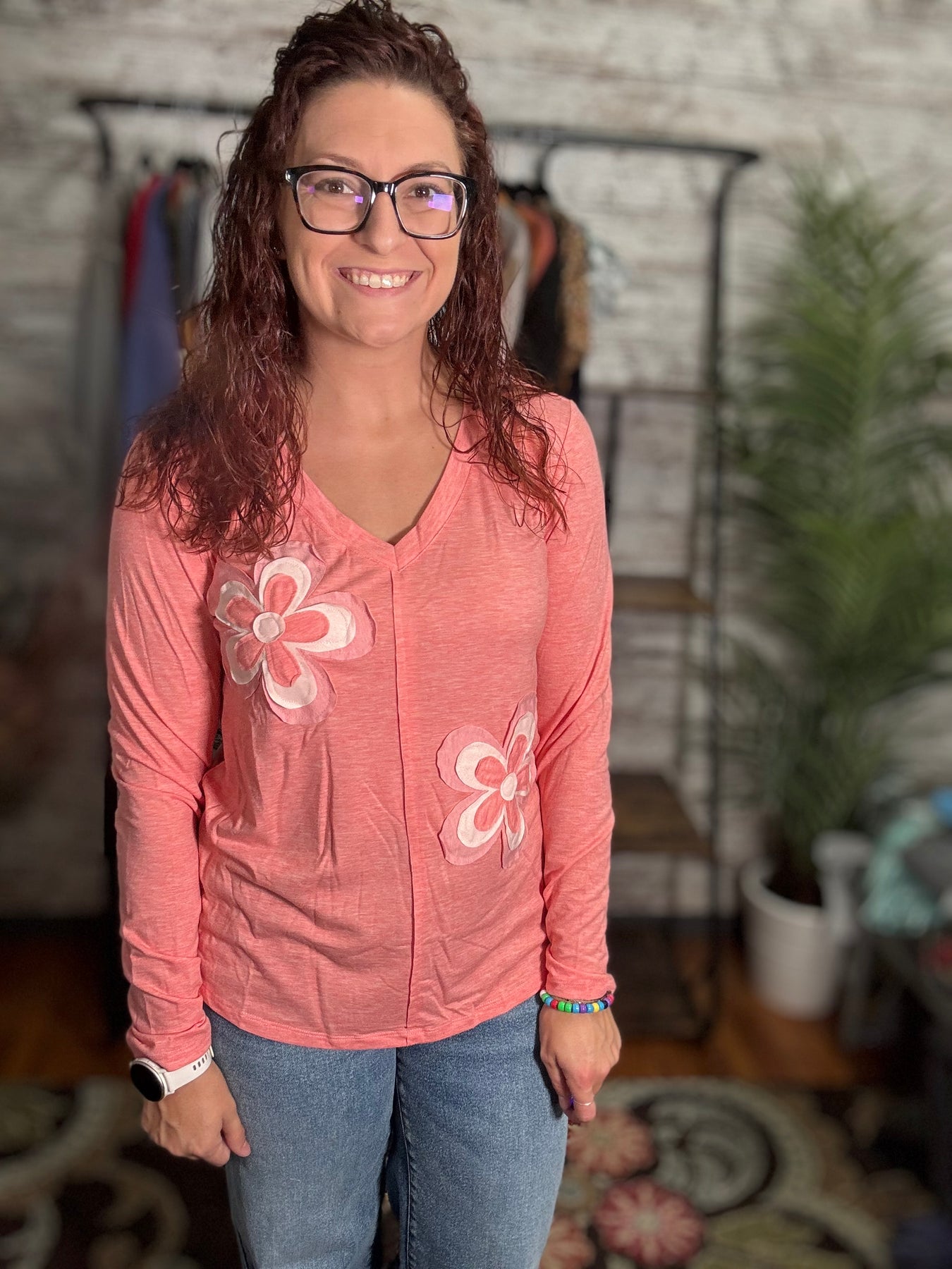 Add a fun twist to your everyday look with this long sleeve top featuring a playful raw edge floral patch on the front.  Its trendy V-neckline brings just the right dash of style, making it perfect for pairing with your favorite jeans or skirts.  Embrace casual chic with a touch of whimsy!